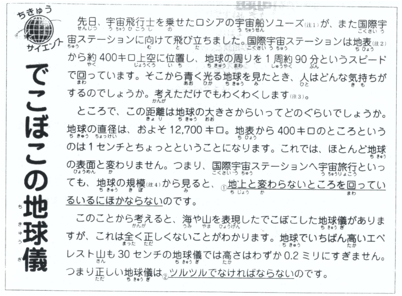 そう、山のところは出っ張っているんだ。 Ừ, Chỗ núi thì phồng lên でもね、これ変だよ。 Nhưng mà, cái này lạ đấy だって、地球の大きさから考えると、国際宇宙ステーションだってこの地球儀の表面から1センチ ぐらいしか離れていないところを回っていることになるんだよ。 Là vì, nếu nghĩ đến độ lớn của địa cầu thì nếu là trạm vũ trụ quốc tế thì sẽ bay vòng quanh chỗ mà chỉ cách khoảng 1 cm tính từ bề mặt quả địa cầu この山なんて1センチ以上出ている。 Ngọn núi này nhô lên khoảng hơn 1 cm này だから変なんだよ。つまり、正しい地球儀はツルツルでな ければいけないんだよ。 Bời vậy mới lạ. Tức là quả địa cầu đúng thì phải trơn bóng nhỉ |
