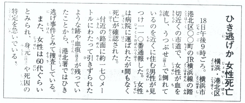 Trên đoạn đường gần nơi chắn tàu tuyến JR Yokohama khu Kouhoku thành phố Yokohama….một người đàn ông sống gần đó đã tìm thấy người phụ nữ chảy máu, nằm ngã úp xuống và đã thông báo theo số 110