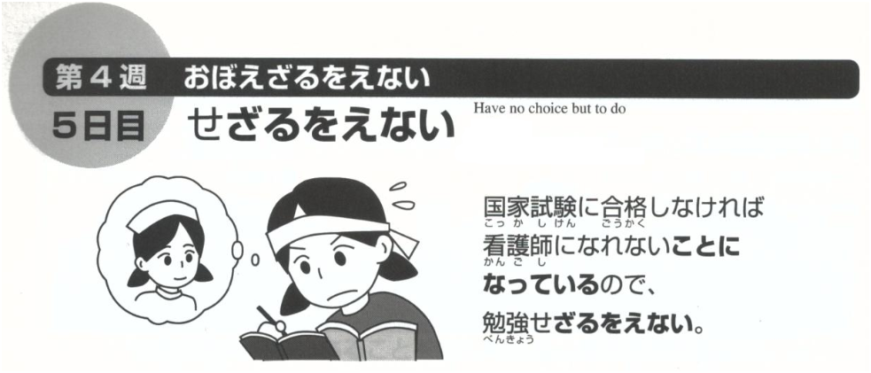 Dùng để diễn tả không thích, không muốn làm điều đó nhưng có lý do nên phải làm. Hán tự: ざるを得ない |