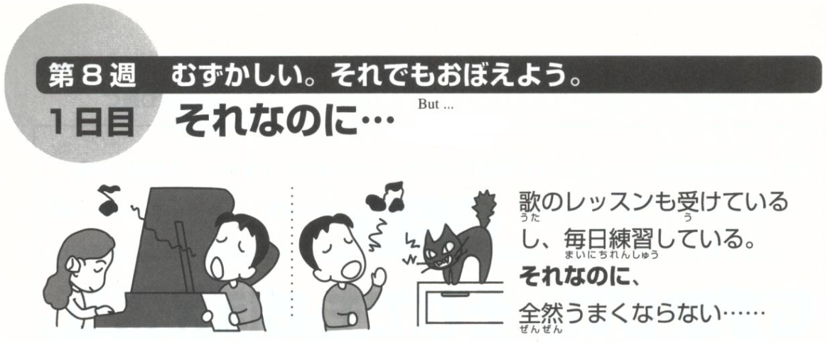 一生懸命勉強している。それなのに成績はよくならない。 Đang học hành chăm chỉ. Thế nhưng thành tích không tiến bộ. |