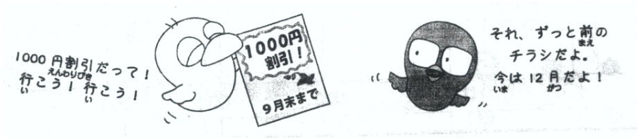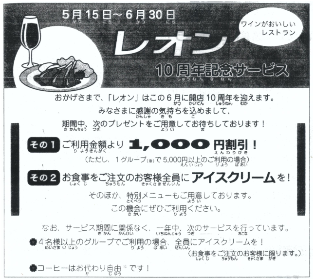 このチラシに書いてある「レオン」って、駅前のレストランのことだよね。 “Reon” có ghi trong tờ rơi này hình như là cái nhà hàng ở trước nhà ga nhỉ? 。。。ふーん、今、10周年記念サービス期間中か。明日、みんなで行こうか。 Uh, hiện giờ đang trong lúc khuyến mãi kỷ niệm 10 năm à. Ngày mai cả nhà cùng đi nhé. |