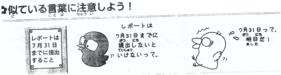 | 女子学生 | わー。それは大変!31日までに提出しないと、減点って書いてあるし、もし出さなかったら、単位、もらえないよ。 |