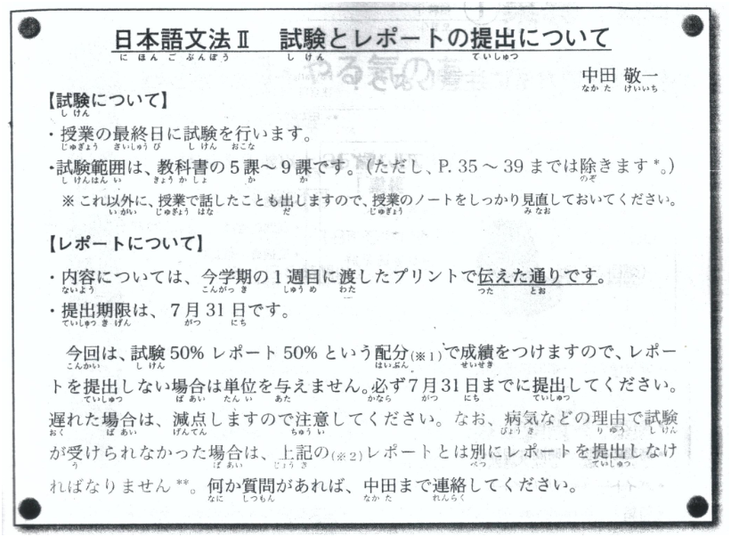 今 回は、試験50%レポート50%という配分で成績をつけますので、レポートを提出しない場合は単位を与えません。必ず7月31日までに提出してください。 遅れた場合は、減点しますので、注意してください。なお、病気などの理由で試験が受けられなかった場合は、上記のレポートとは別にレポートを提出しなければなりません。何か質問があれば、中田まで連絡してください。