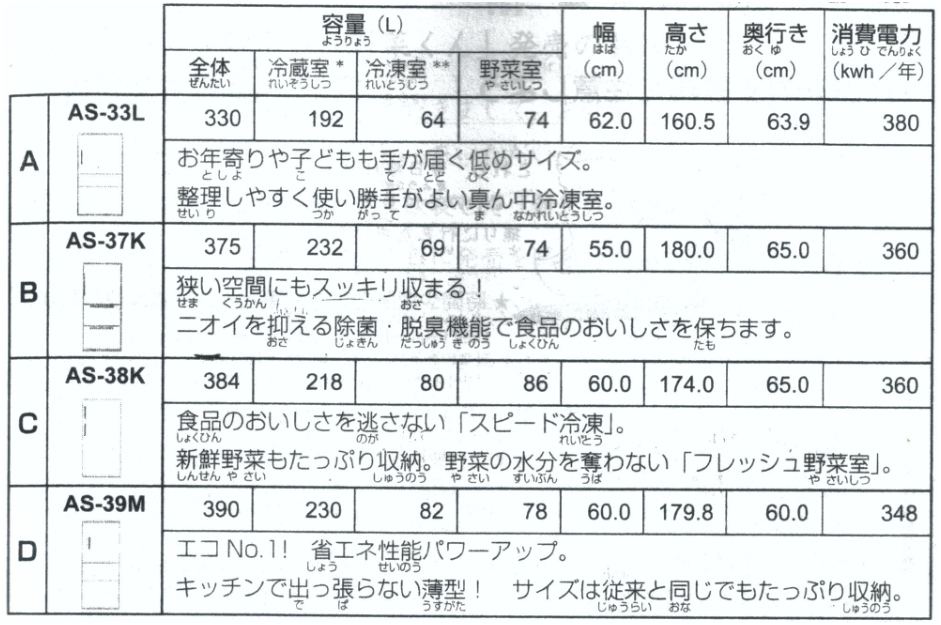 下の表は冷蔵庫のカタログの一部である。後の問いになさい。