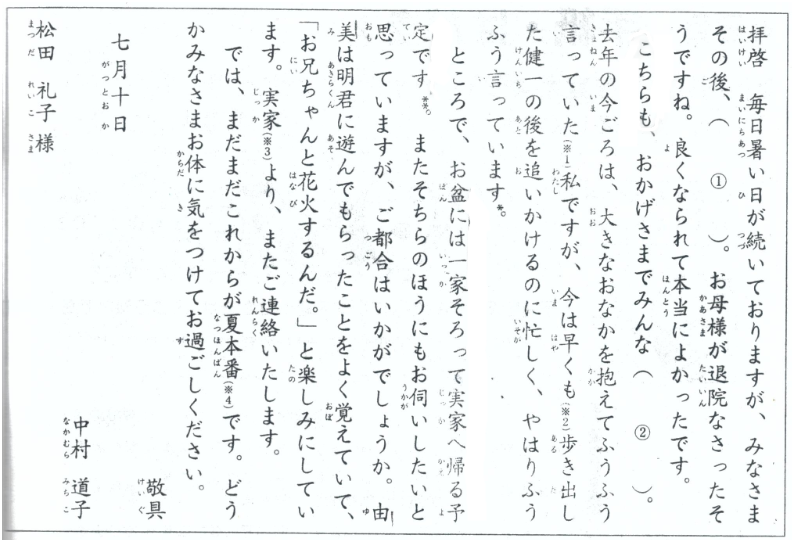Gửi bạn Matsuda Reiko Mỗi ngày trời vẫn tiếp tục nóng, gia đình bạn mọi người vẫn khỏe chứ? Nghe nói là mẹ bạn đã xuất viện rồi, mình thật mừng là bà đã trở nên khỏe hơn. Nhờ trời, gia đình mình vẫn khỏe. Khoảng thời gian này của năm ngoái mình vẫn còn đang thở hổn hển ôm cái bụng to đùng thế mà bây giờ mình cũng lại hổn hển, bận rộn đuổi theo sau bé Kenichi đang tập đi sớm. Nhân tiện, mình có kế hoạch là sẽ kéo cả nhà về nhà bố mẹ mình trong lễ Obon. Mình định sẽ lại đến thăm nhà bạn. Không biết là có thuận tiện không? Bé Yumi rất nhớ chuyện được nhóc Akira chơi cùng và đang rất háo hức được “xem pháo hoa cùng với anh Akira” . Về đến nhà bố mẹ, mình sẽ liên lạc lại. Từ giờ trở đi bắt đầu đi vào giữa hè, mình mong cả nhà bạn, mọi người đều giữ gìn sức khỏe tốt. Ngày 10 tháng 7 Nakamura Michiko |