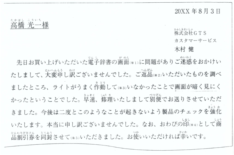 先日お買い上げいただいた電子辞書の画面に問題がありご迷惑をおかけいたしまして、大変申し訳ございませんでした。