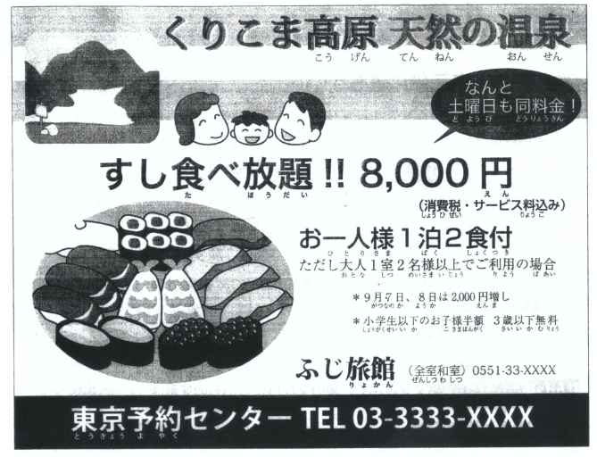| 2. | この広告には1泊2食付きで8,000円と書いてある。 |