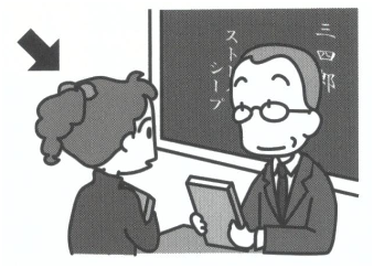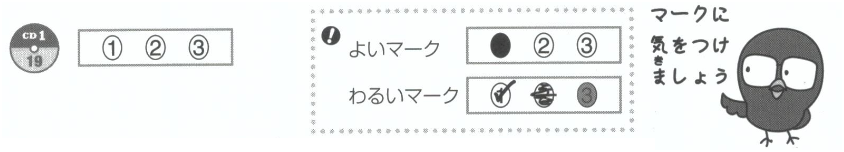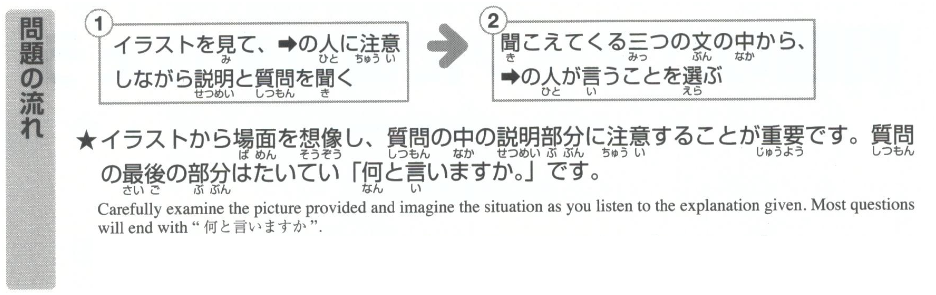 | ①イラストを見て➡の人に注意しながら説明と質問を聞く | → | ②聞こえてくるの文の中から、➡の人が言うことを |