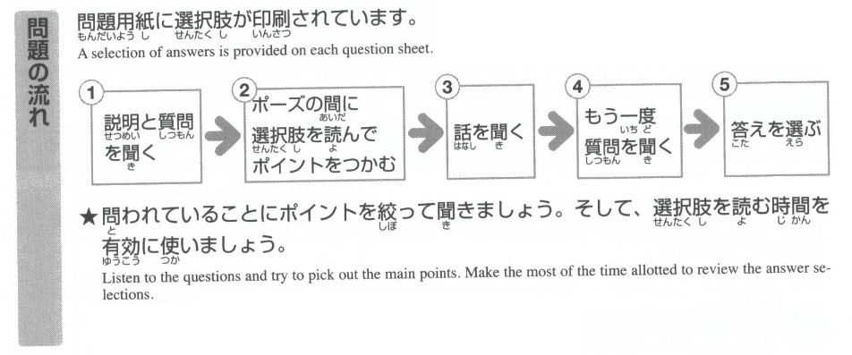 | ①説明と質問を聞く | → | ②ポーズの間に選択肢を読んでポイントをつかむ | → | ③話を聞く | → | ④もう一度質問を聞く | → | ⑤答えを選ぶ |