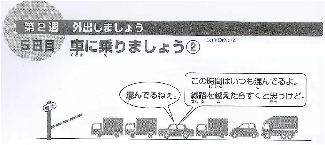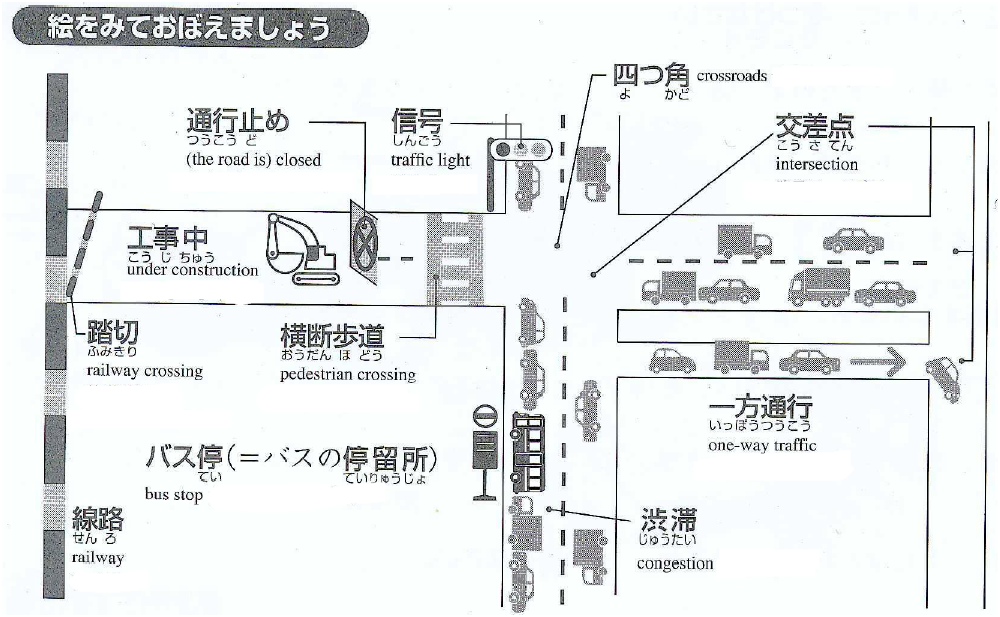 5.(一方通行(いっぽうつうこう))の(みち)反対(はんたい)(はし)ってくる(くるま)がいて、びっくりした。