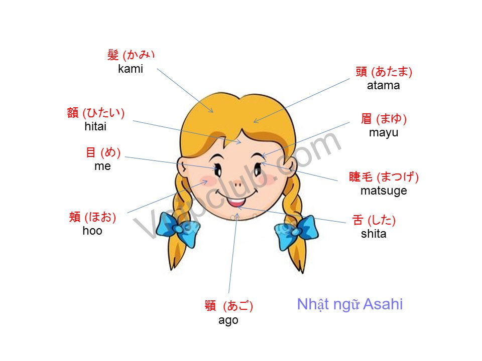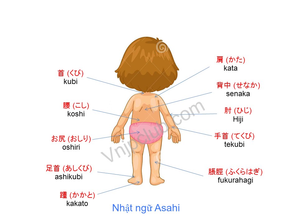 Các bộ phận của cơ thể (体の部位)Tổng hợp từ vựng về các bộ phận cơ thể bằng tiếng Nhật kèm phiên âm Romaji và nghĩa tiếng Việt giúp nâng cao vốn từ và phát âm chuẩn cho người học trong giao tiếp hàng ngày. Bật/Tắt PHIÊN ÂM HÁN TỰ 日本語 Romaji ベトナム語 頭 (あたま) Atama Đầu 鼻 (はな) Hana Mũi 歯 (は) Ha Răng のど Nodo Họng おなか Onaka Bụng 手 (て) Te Tay 指 (ゆび) Yubi Ngón tay 足 (あし) Ashi Chân 目 (め) Me Mắt 耳 (みみ) Mimi Tai 口 (くち) Kuchi Miệng 胸 (むね) Mune Ngực 腕 (うで) Ude Cánh tay へそ Heso Rốn 爪 (つめ) Tsume Móng tay ひざ Hiza Đầu gối 日本語 Romaji ベトナム語 首 (くび) Kubi Cổ 腰 (こし) Koshi Hông お尻 (おしり) Oshiri Mông 足首 (あしくび) Ashikubi Cổ chân 踵 (かかと) Kakato Gót chân 肩 (かた) Kata Vai 背中 (せなか) Senaka Lưng 肘 (ひじ) Hiji Khuỷu tay 手首 (てくび) Tekubi Cổ tay 脹脛 (ふくらはぎ) Fukurahagi Bắp chân 日本語 Romaji ベトナム語 髪 (かみ) Kami Tóc 額 (ひたい) Hitai Trán 頬 (ほお) Hoo Má 顎 (あご) Ago Cằm 頭 (あたま) Atama Đầu 眉(まゆ) Mayu Lông mày 睫毛 (まつげ) Matsuge Lông mi 舌 (した) Shita Lưỡi