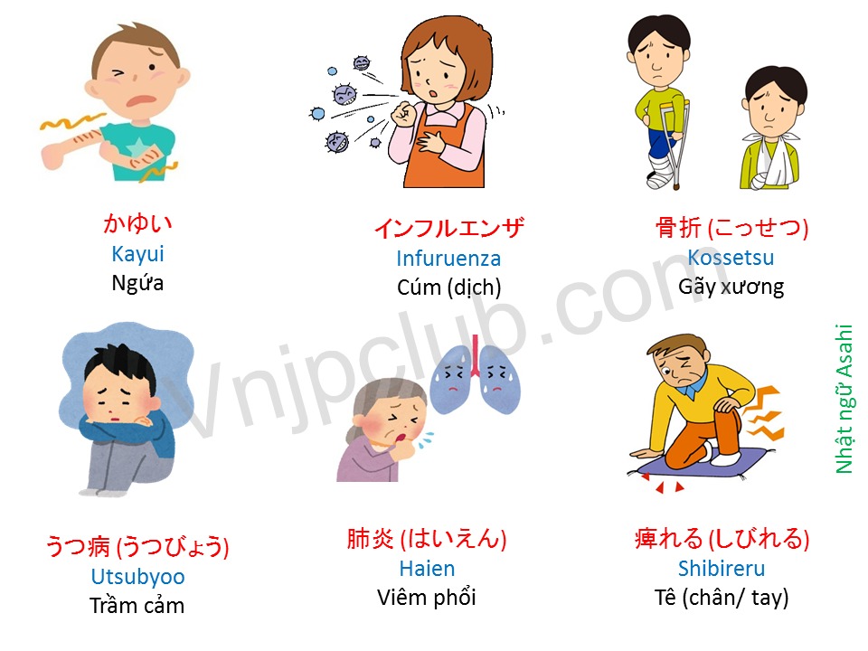 Các từ vựng liên quan đến các bệnh phổ biến trong tiếng Nhật từ bệnh truyền nhiễm, dị ứng đến các bệnh mãn tính giúp người học mở rộng vốn từ và giao tiếp chính xác trong các tình huống y tế hàng ngày.