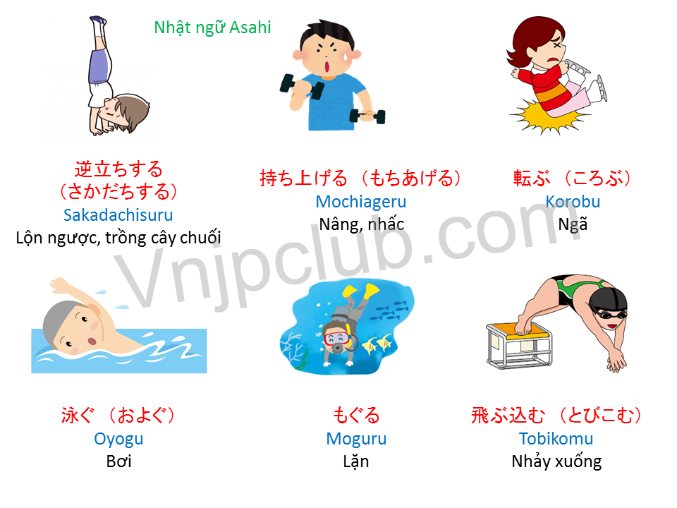 Từ vựng tiếng Nhật về các động tácTích lũy vốn từ vựng các động từ tiếng Nhật thông dụng thể hiện các hành động hàng ngày từ di chuyển, vận động đến các cử chỉ đơn giản, giúp nâng cao khả năng giao tiếp và hiểu biết ngôn ngữ tự nhiên. Bật/Tắt PHIÊN ÂM HÁN TỰ 日本語 Romaji ベトナム語 行く (いく) Iku Đi 立つ (たつ) Tatsu Đứng 座る (すわる) Suwaru Ngồi 走る (はしる) Hashiru Chạy 飛ぶ (とぶ) Tobu Bay 跳ぶ (とぶ) Tobu Nhảy 登る (のぼる) Noboru Leo, trèo 泳ぐ (およぐ) Oyogu Bơi もぐる Moguru Lặn 飛ぶ込む (とぶこむ) Tobikomu Nhảy xuống 逆立ちする (さかだちする) Sakadachirusu Lộn ngược, nhảy xuống はう Hau Bò ける Keru Đá 振る (ふる) Furu Vẫy 持ち上げる (もちあげる) Mochiageru Nâng, nhấc 投げる (なげる) Nageru Ném たたく Tataku Đánh, đập, vỗ 引く (ひく) Hiku Kéo 押す (おす) Osu Đẩy 曲げる (まげる) Mageru Uốn, gập, bẻ cong 伸ばす (のばす) Nobasu Duỗi thẳng, kéo dài ra 転ぶ (ころぶ) Korobu Ngã 振り向く (ふりむく) Furimuku Ngoảnh lại